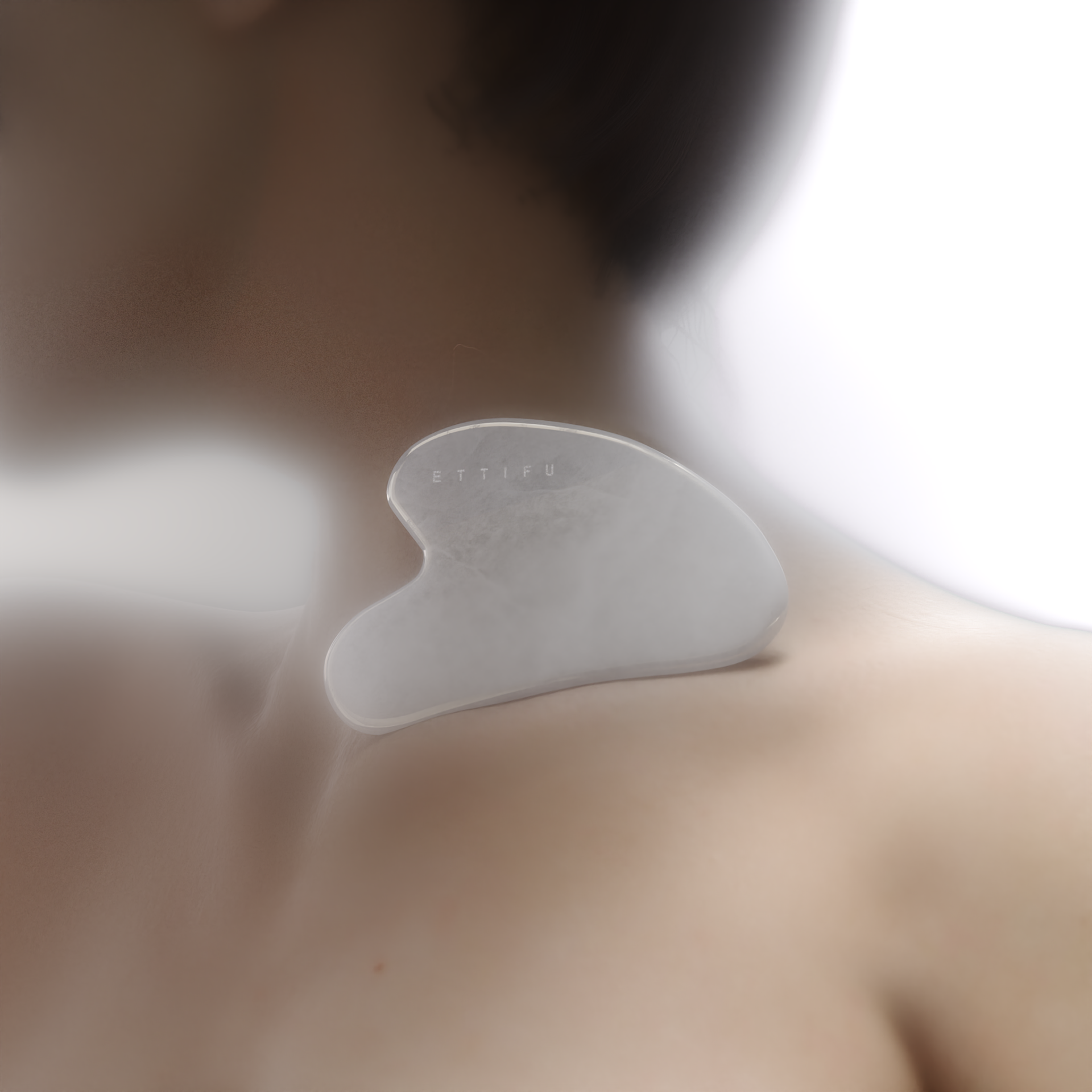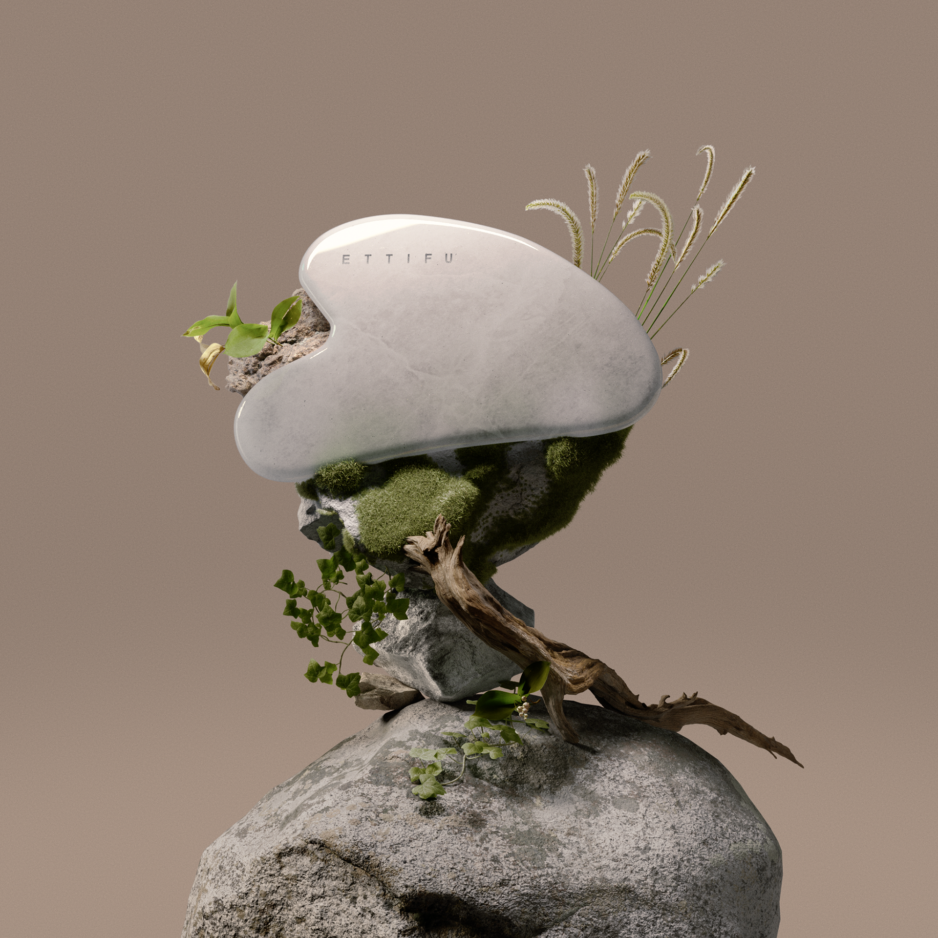 The gua sha tool, like a piece of art, is balanced among plants and stones,