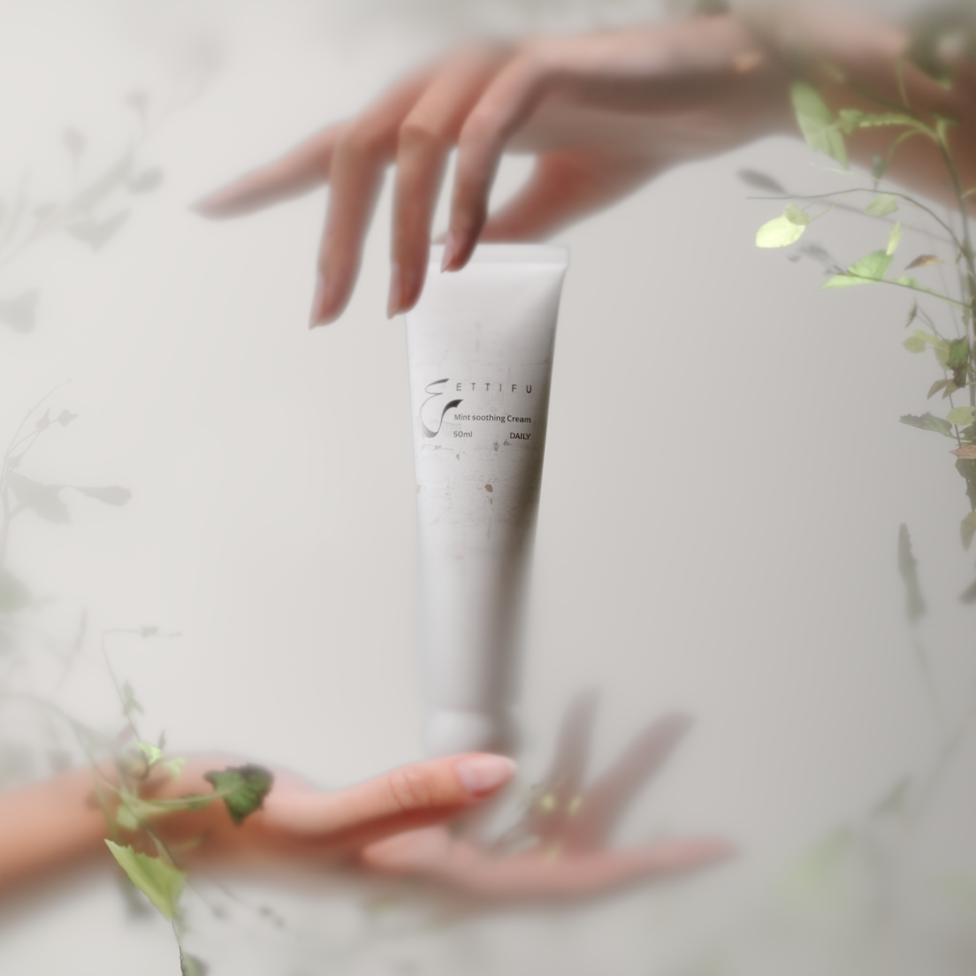 Centered around mint growing by the lakeside, the product is arranged with fresh greenery and a serene setting, perfectly blending both elements within the scene.