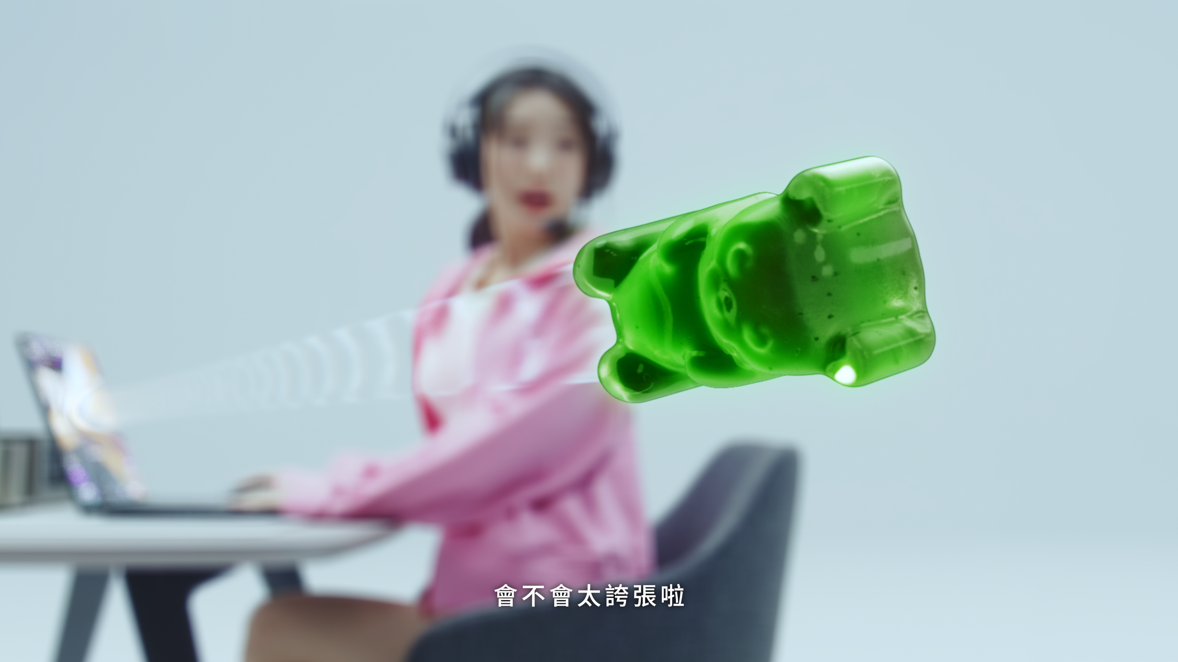A gummy bear-shaped bullet bursts from the laptop, humorously symbolizing the explosive performance and fun of gaming mode. Upon impact with a wall, the surface deconstructs and seamlessly transitions into an AI creative interface. This playful yet powerful sequence connects gaming energy with creative breakthrough—the wall shatters like a canvas being torn open, unleashing a wave of imagination. The result is a visual signature that blends approachability with forward-thinking innovation.