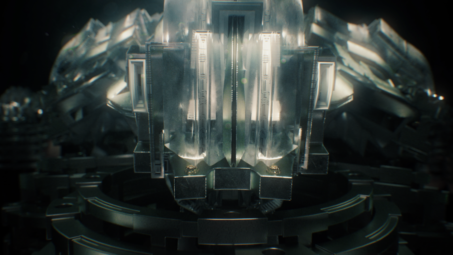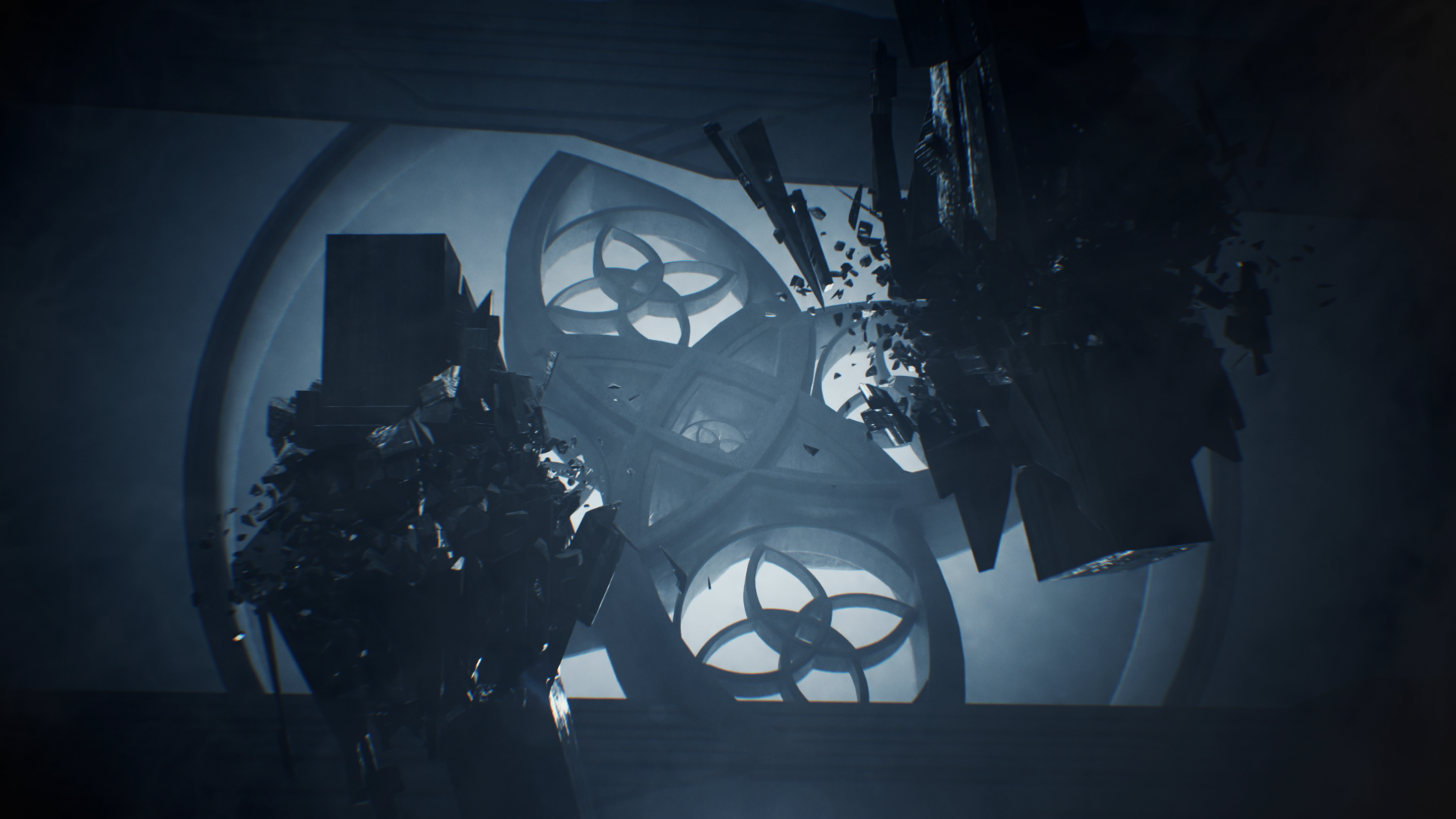 一開始帶到主角象徵圖騰 構成的建築和代表主角的象徵物-鑽石, 代表正要進入主角的內心世界。第一卡場景的構成部分是以演唱者的圖騰作為素構成, 使用演唱者象徵的圖騰加強主角和mv的連結。 整體色調也偏陰暗而且光線也偏冷呈現主角內心負面狀態。
