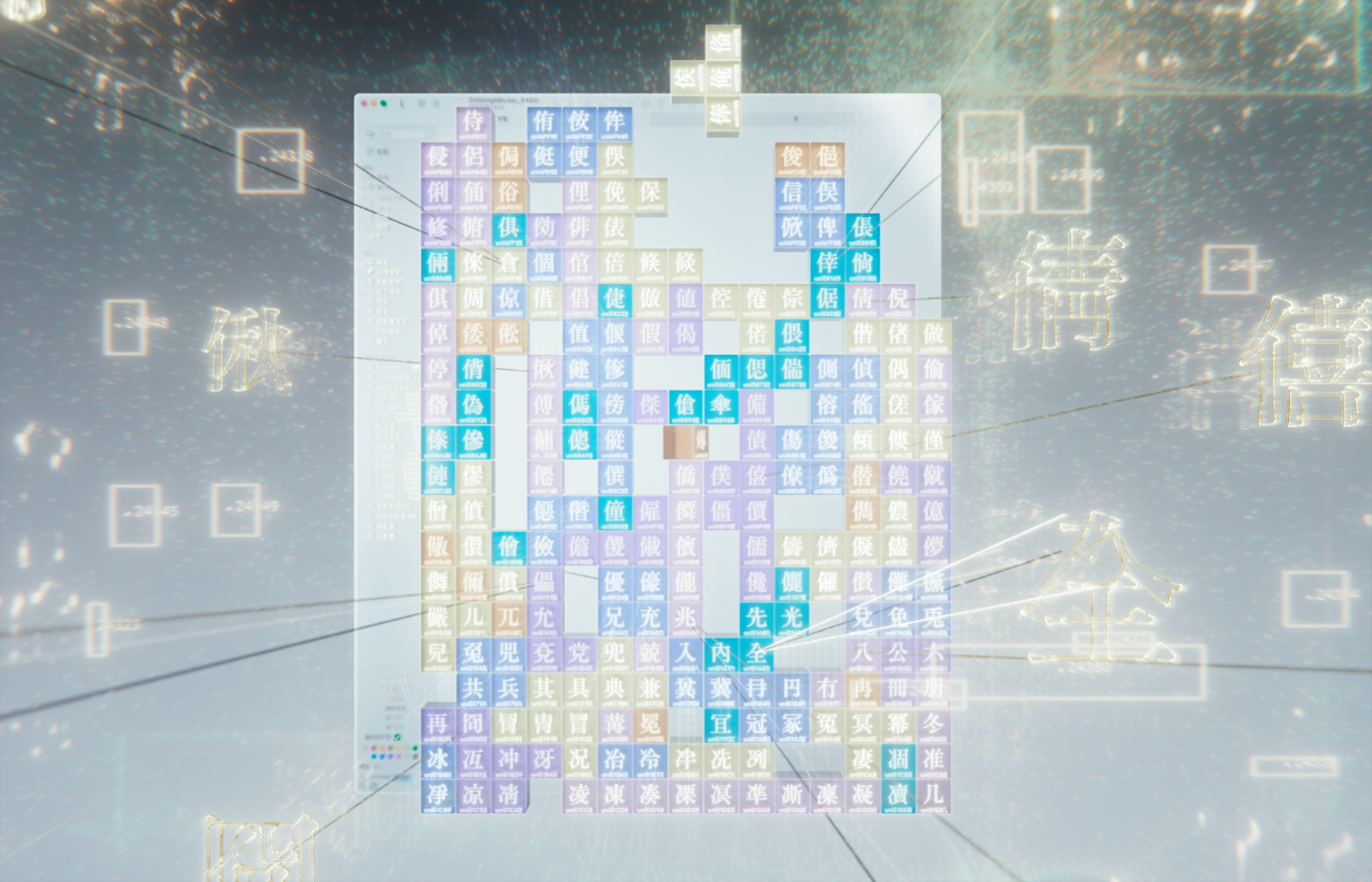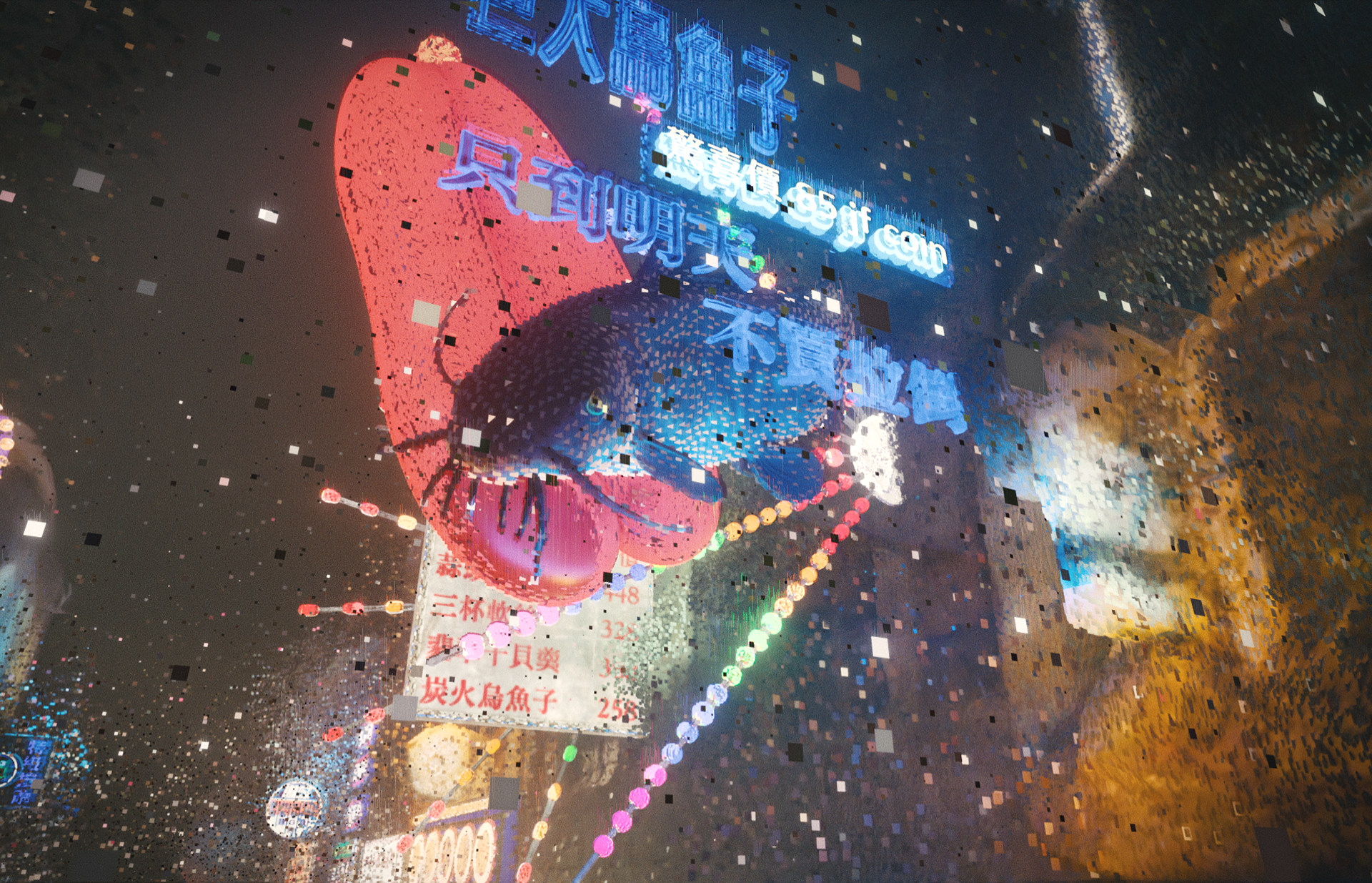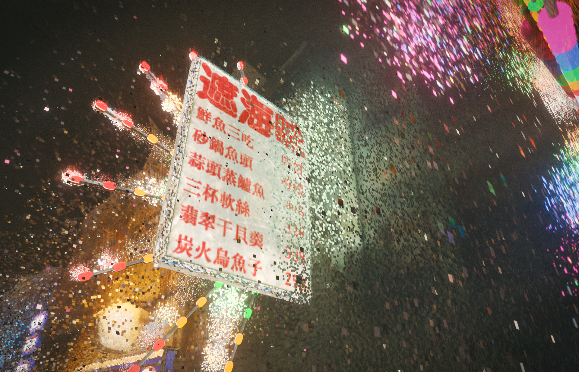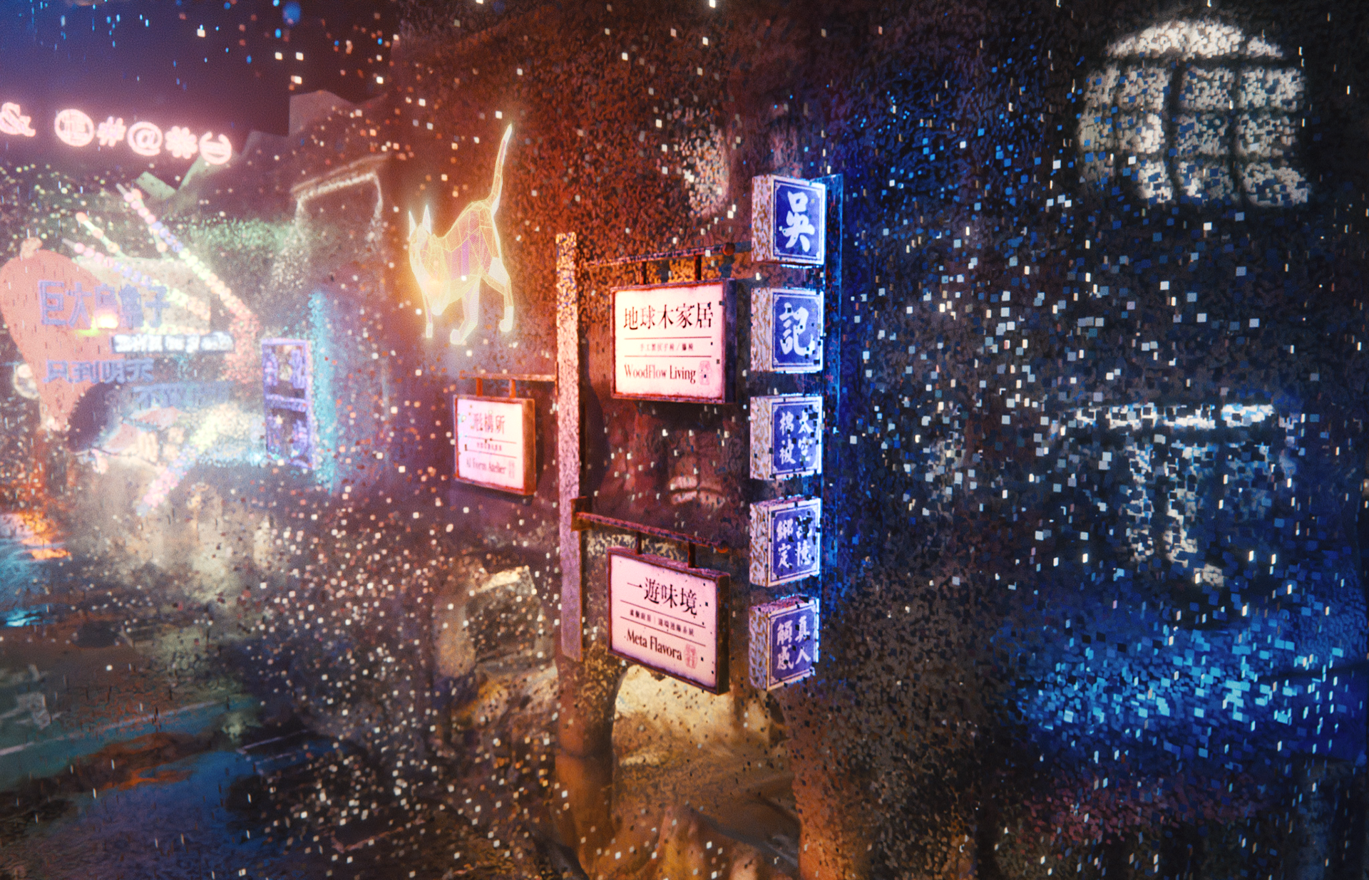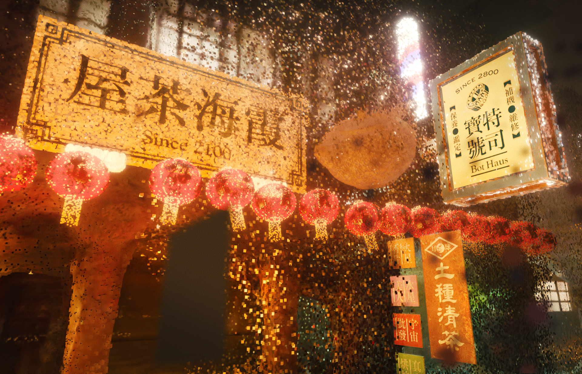 This image reimagines Dihua Street as a data-driven cyberpunk cityscape, with Ri Xing Song No.2 typeface featured across a variety of iconic Taiwanese neon signs. By deconstructing the physical environment into point clouds, we visualize the transition from analog to digital—showing how typography, once cast in metal, continues to live and evolve in a futuristic cultural context.