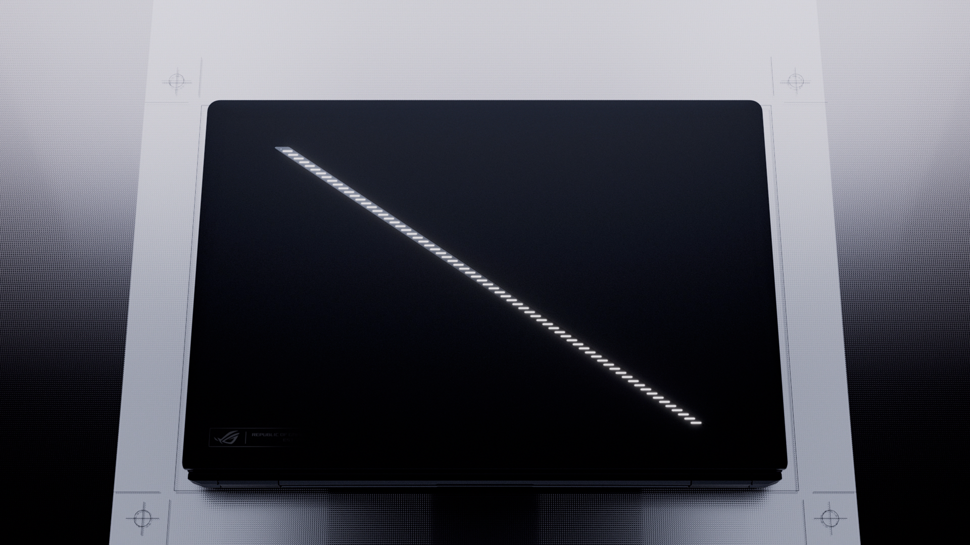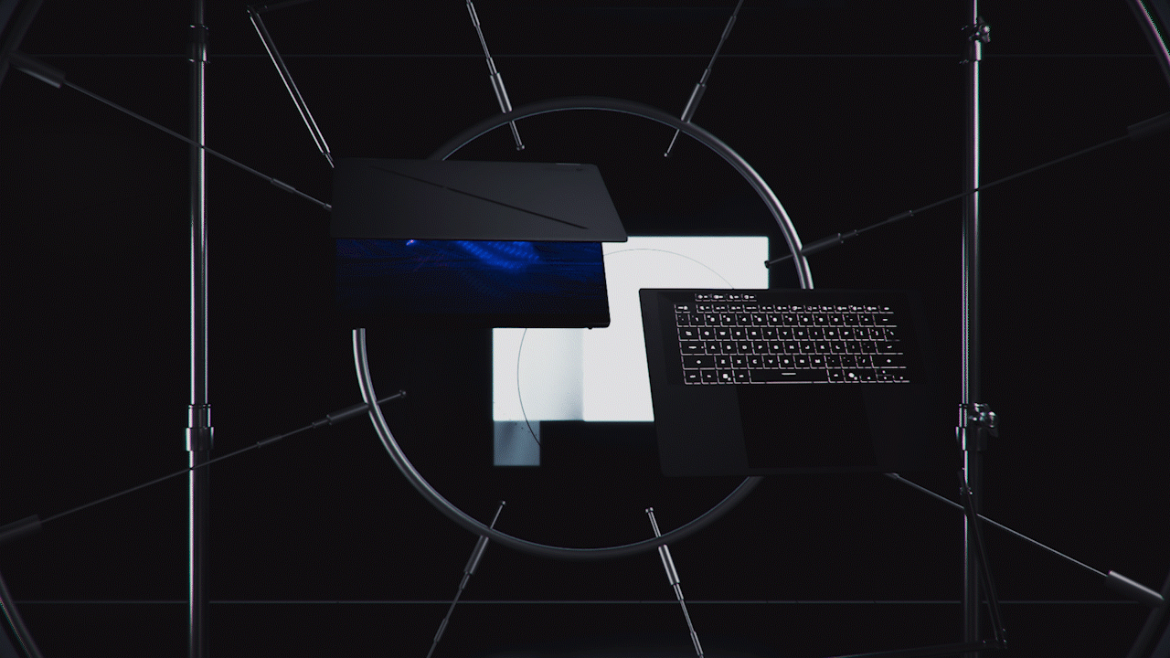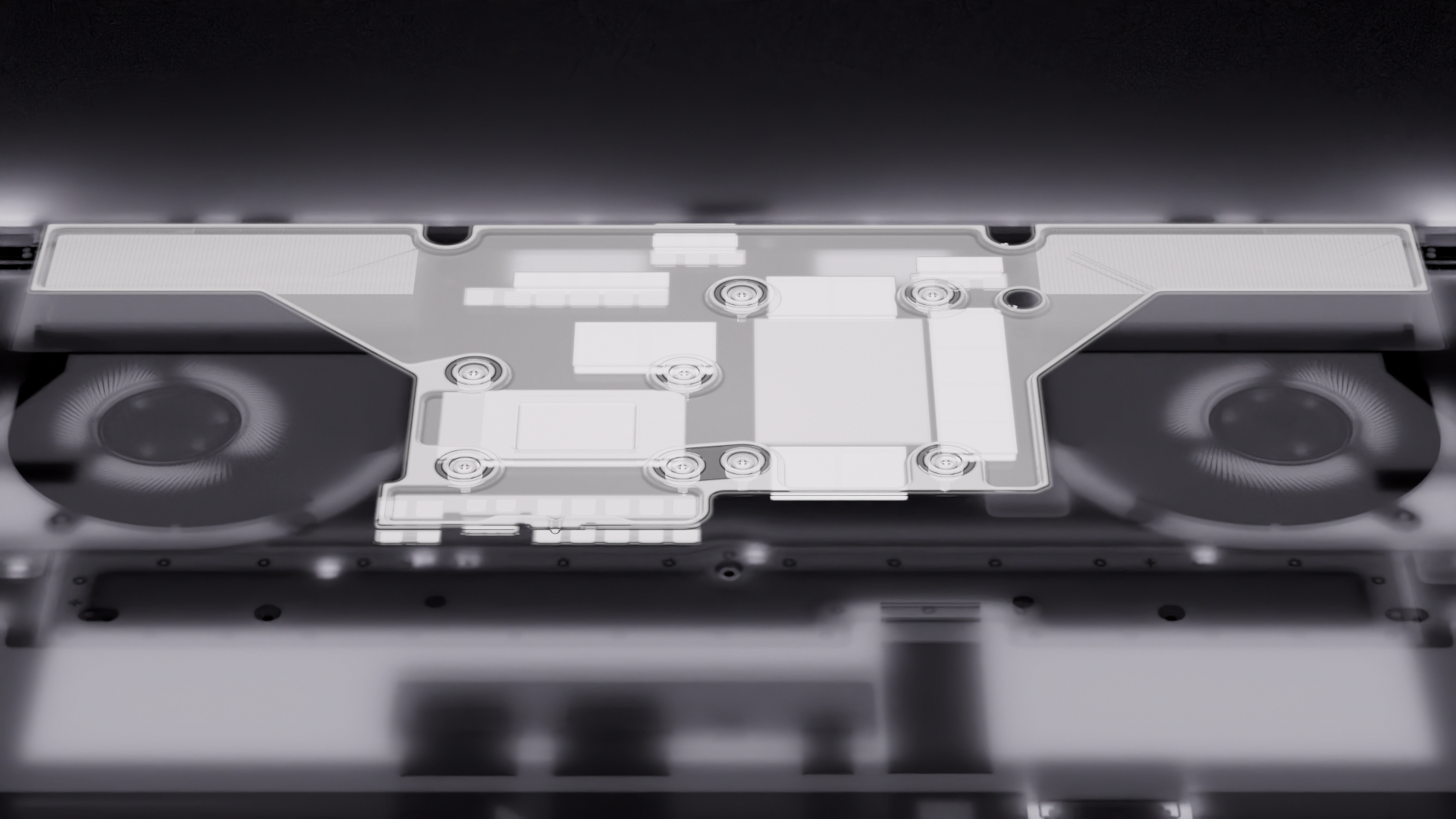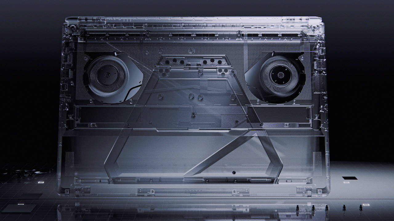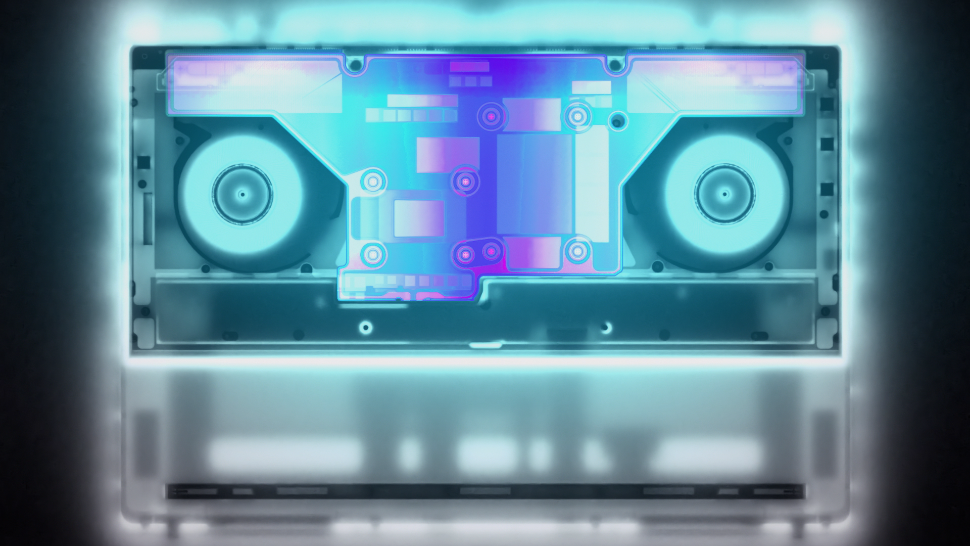 The view pulls back as the system folds into the laptop.Air intake and exhaust elements glow,