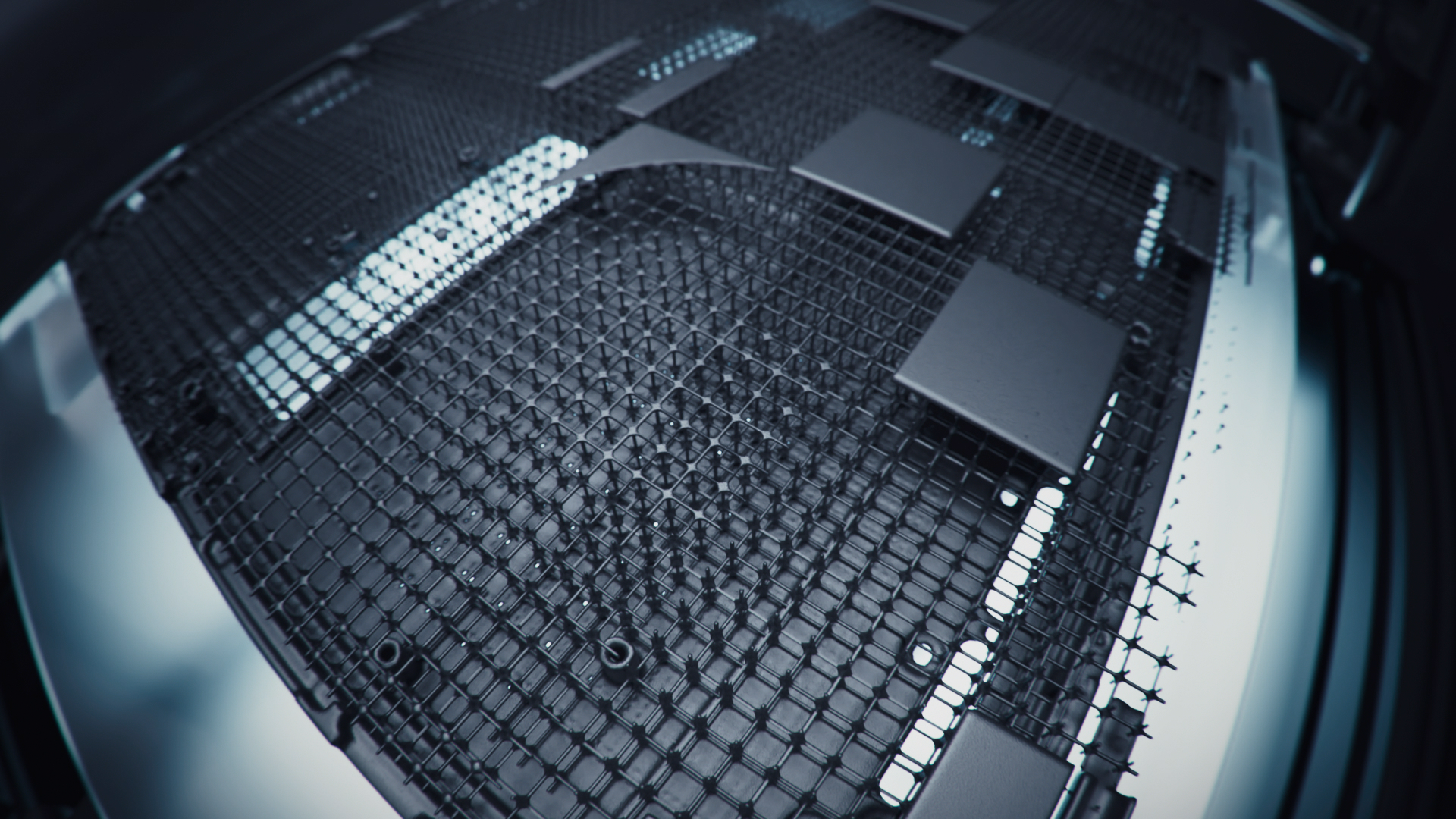 Liquid metal introduces the scene,followed by close-ups of the graphene cooling structure.