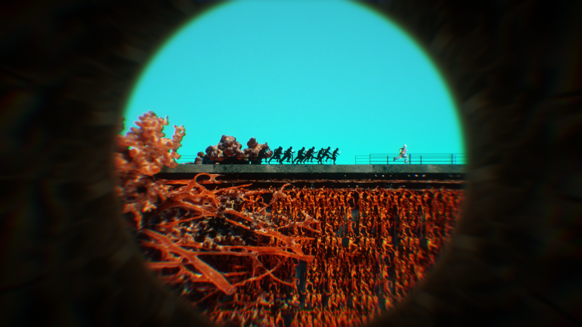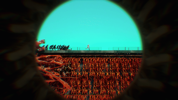 After entering this virus-filled world, we can immediately see that the protagonist was being chased by a group of black-clad policemen. These scenes were based on the scenes of vintage movies. The protagonist was chased to the end of the bridge, with nowhere to go, and then got kicked by the police.