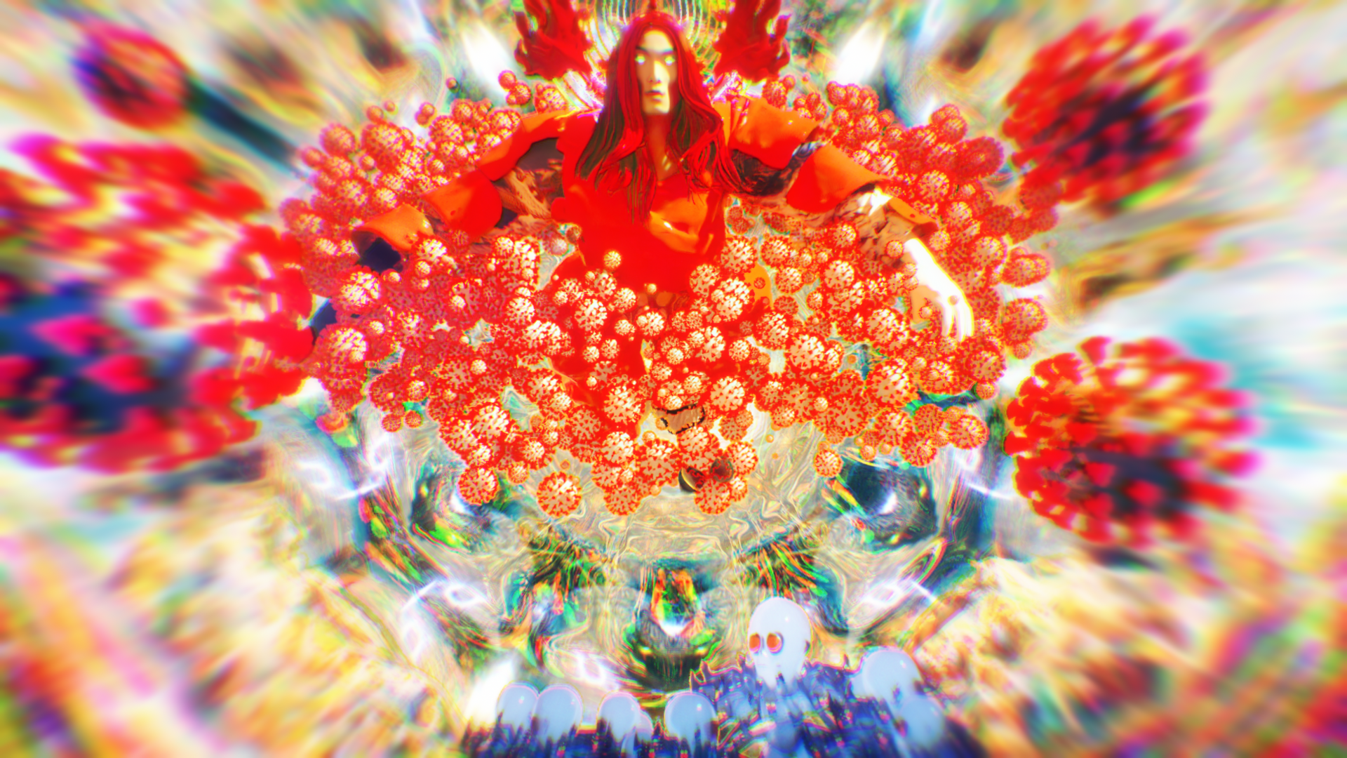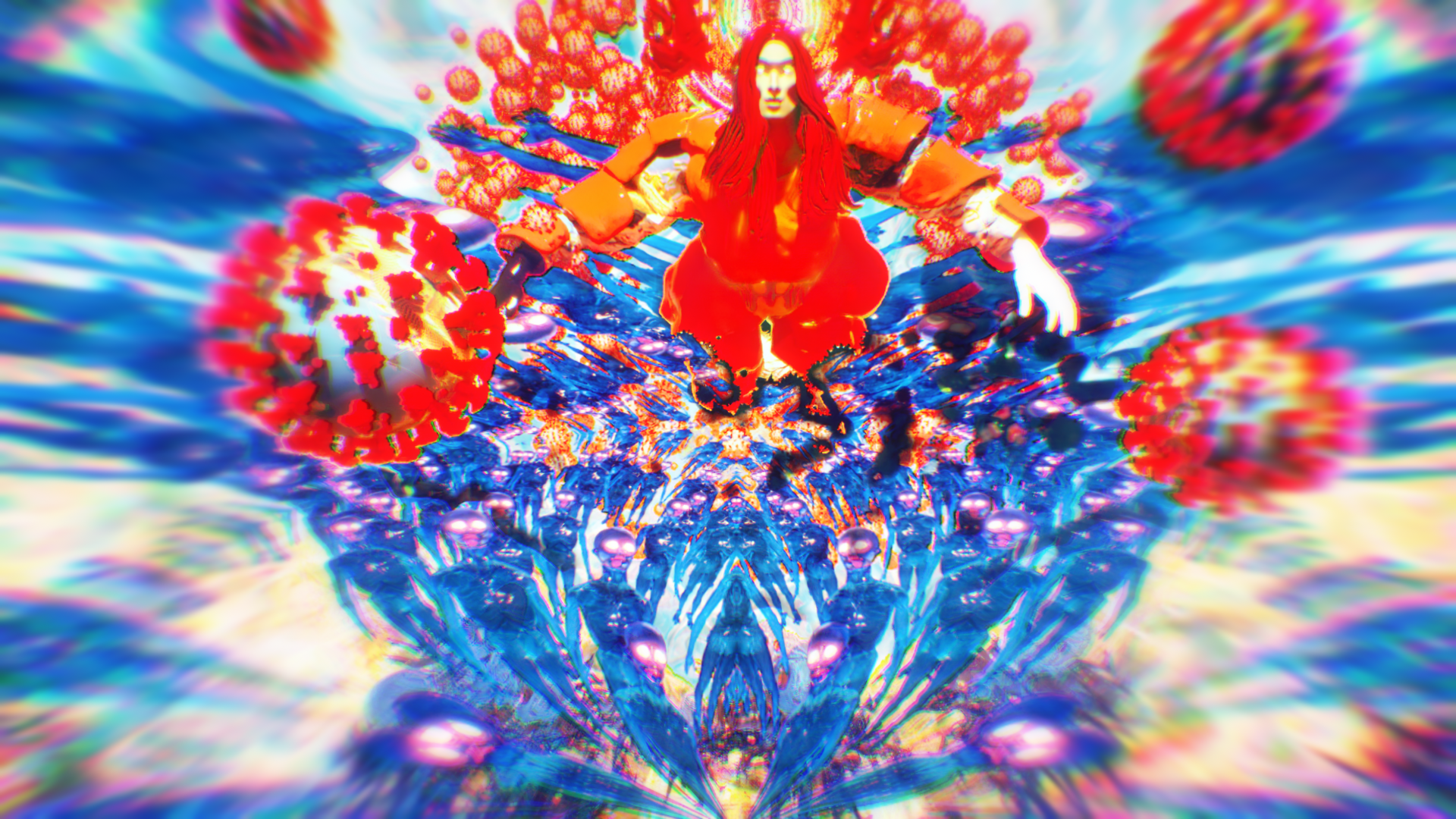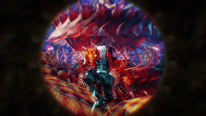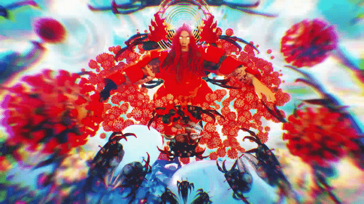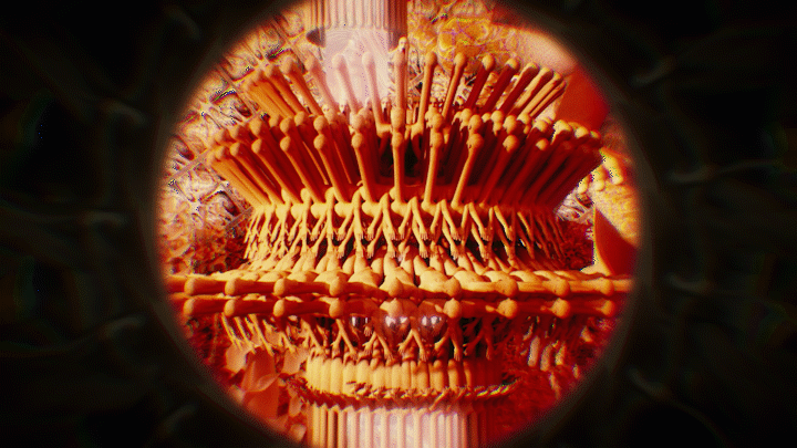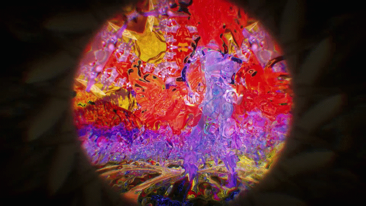 In the laboratory inside a cave, there are Amazing Show’s past self-made musical instruments and 電火王 album cover, and in the corner there is a machine that can peek into another world. As the camera slowly entered the world inside the machine, a world full of viruses slowly unravel.